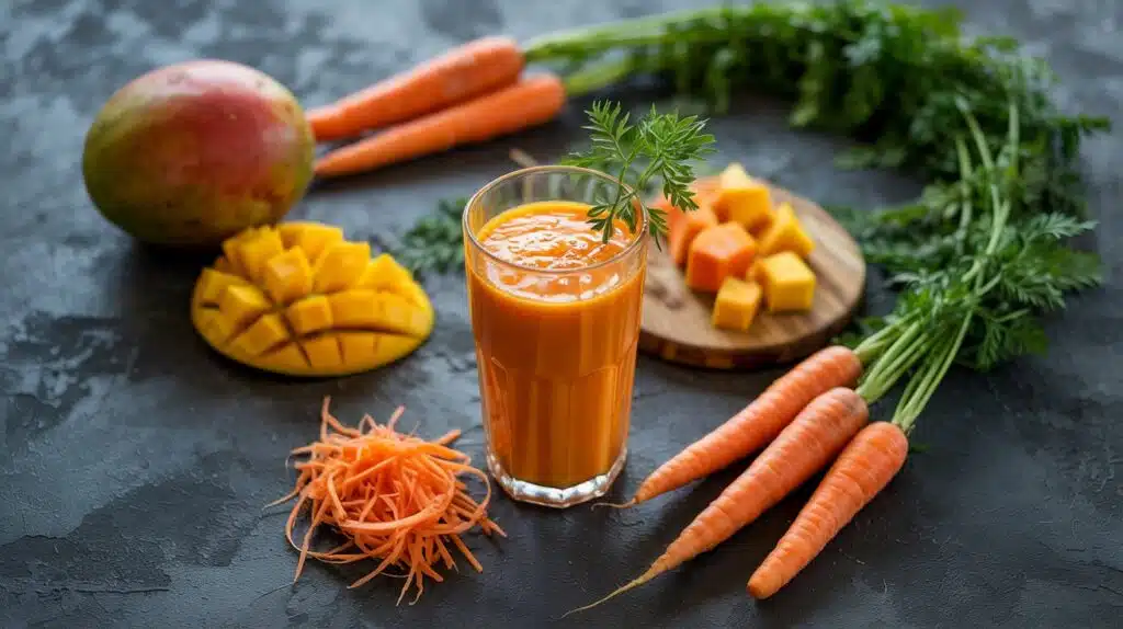 - Place chopped carrots and mango pieces into a blender. Add the fresh orange juice, water, and ice cubes.